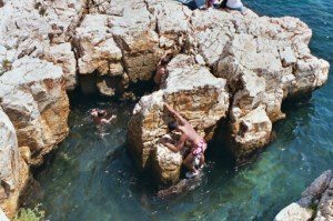 This is a little cove off the coast of Villefranche sur Mer, just south of Nice. The kids were locals, and they were climbing the rock and then jumping off into the pool below.