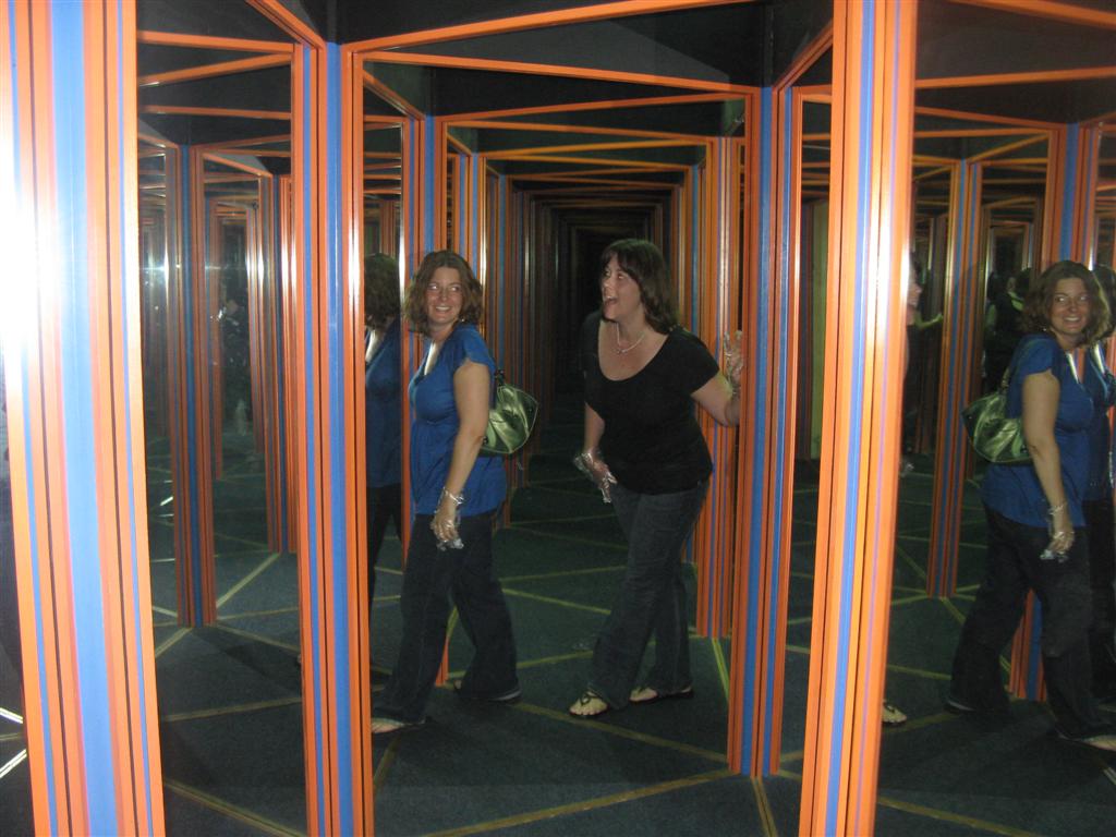 We went to a mirror maze, where they made us wear plastic gloves on our hands so we wouldn’t leave fingerprints on the glass and give away which ones were mirrors. We had a blast – we went through three times, and laughed our asses off the whole time. Here we are in the maze, and we both think we’re looking at the camera: