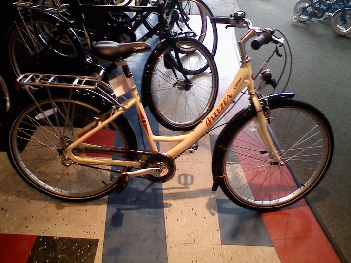 David had to go to the bike store today to get reflectors put on and I met him there after I went to the movies (The Losers = awesome).  I’ve been toying with the idea of getting a new bike for a little while, and we just signed up for a 19-mile ride at the end of the month, so now is as good a time as any.  I found two that I really liked and test rode them both.  First, the Breezer Citizen: