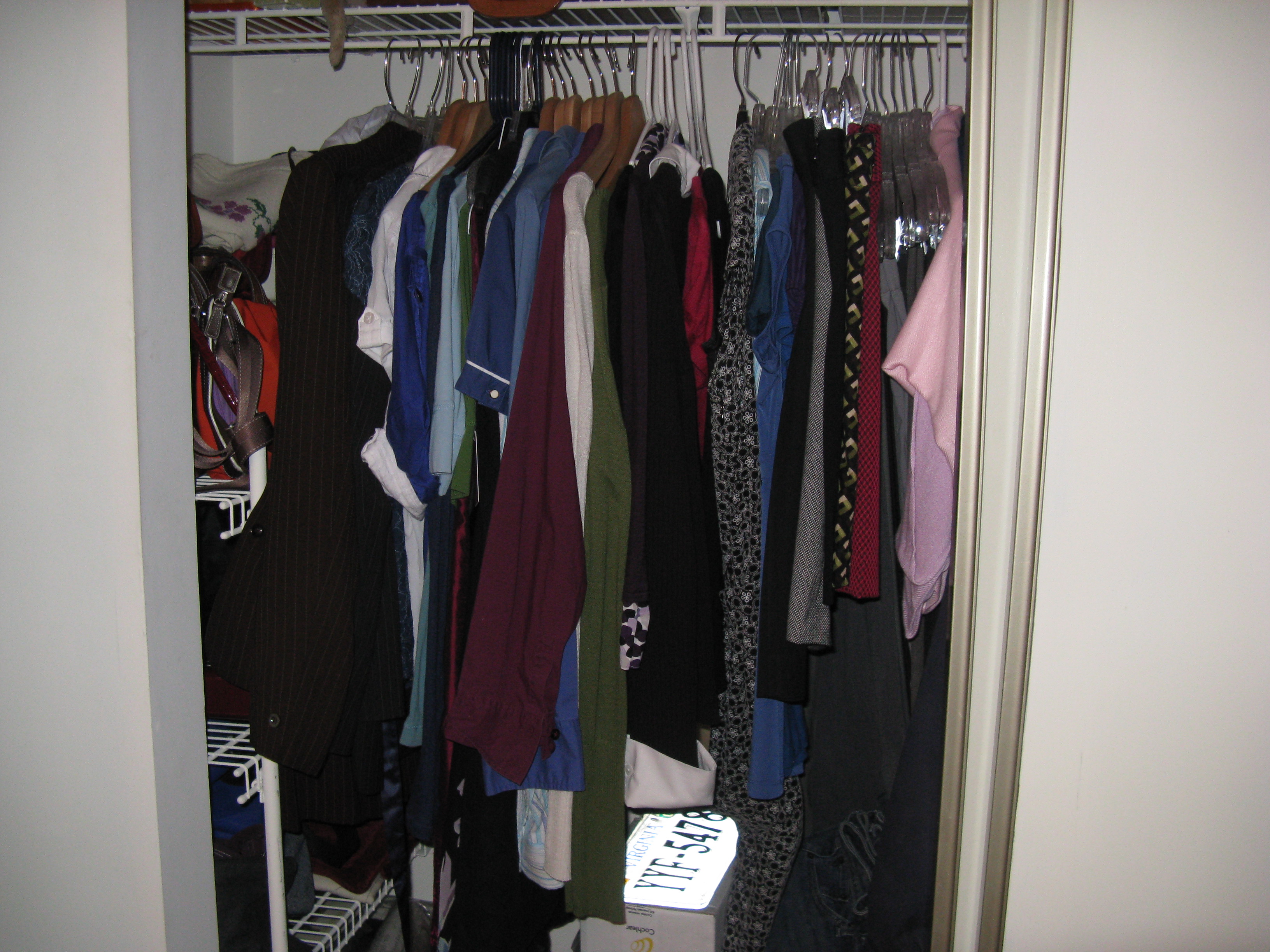 Well, that’s one side of the closet.  The other side has luggage and holiday decorations and crap.  Irrelevant to this discussion.  The reason I’m showing you this is because slowly but surely, over the past year or so, I’ve moved clothes from my closet in our room to this closet because I’ve grown out of them and I didn’t want to look at them anymore.  There are still several things in my closet that should go here, but, as you see, I’ve run out of room.  This collection includes: two suits, THE dress, a fitted boy-blue button down down shirt with pearly buttons that looked amazing on me, the pencil skirt I was wearing the day David and I first kissed, this shirt, several awesome pairs of pants, and an untold number of other items of clothing that I would ordinarily wear to work.  Isn’t that terrible?  There’s probably $1000 or more of clothes in there that I can’t wear right now, which is really such a bummer.  The corollary, of course, is that I’ve had to slowly but surely buy bigger clothes, and shopping has become my least favorite activity and hasn’t been cheap.