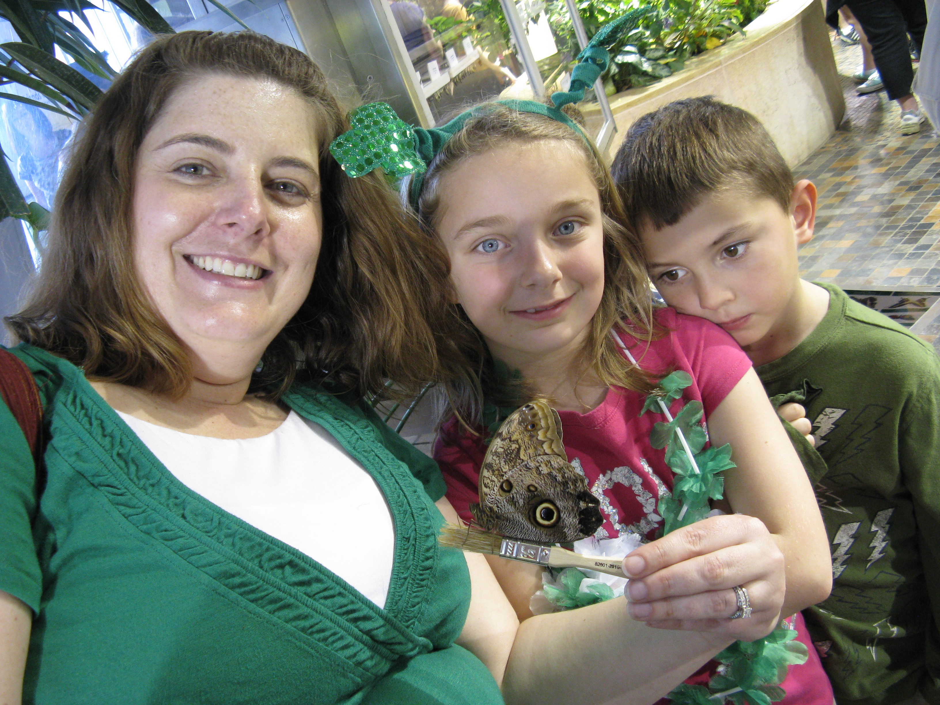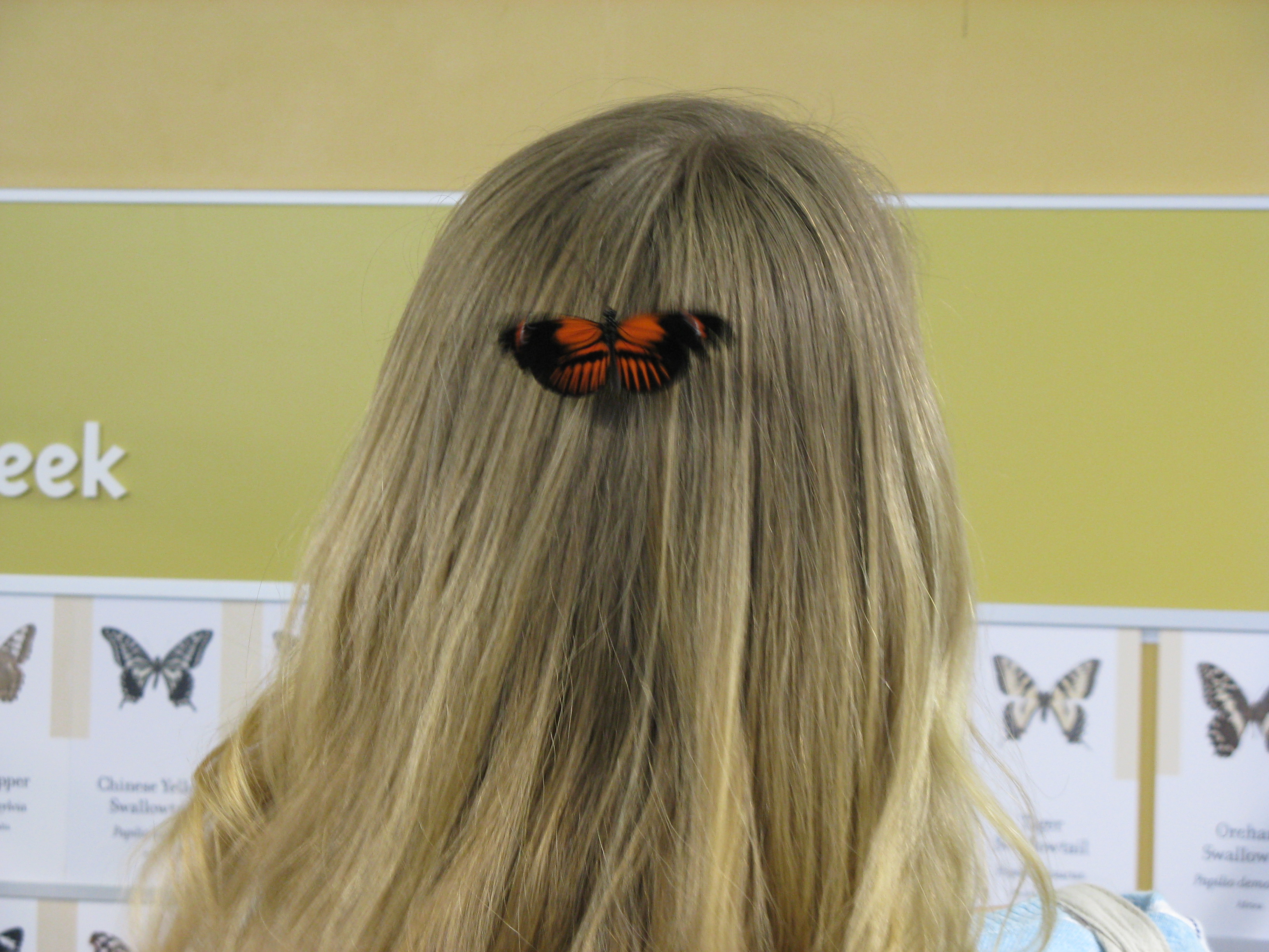 One landed on Ellie’s leis, but I wasn’t quick enough to get a picture.  This lady had one land in her hair: